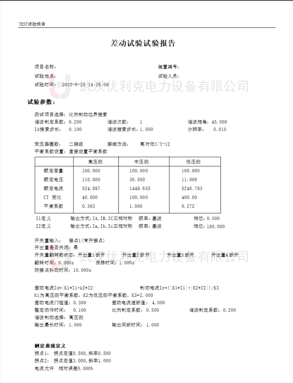 平衡系數:根據CT變比和變壓器額定電流計算高低壓側的平衡系數(如高壓側Kh=1,低壓側Kl=0.795)。