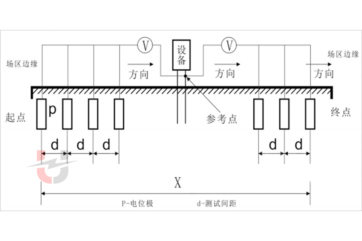 電壓極 P 與接地端的距離(DPE):≈0.618×DCE(基于 “零電位點” 理論,最小化測試誤差),若現(xiàn)場空間受限,可調(diào)整為
